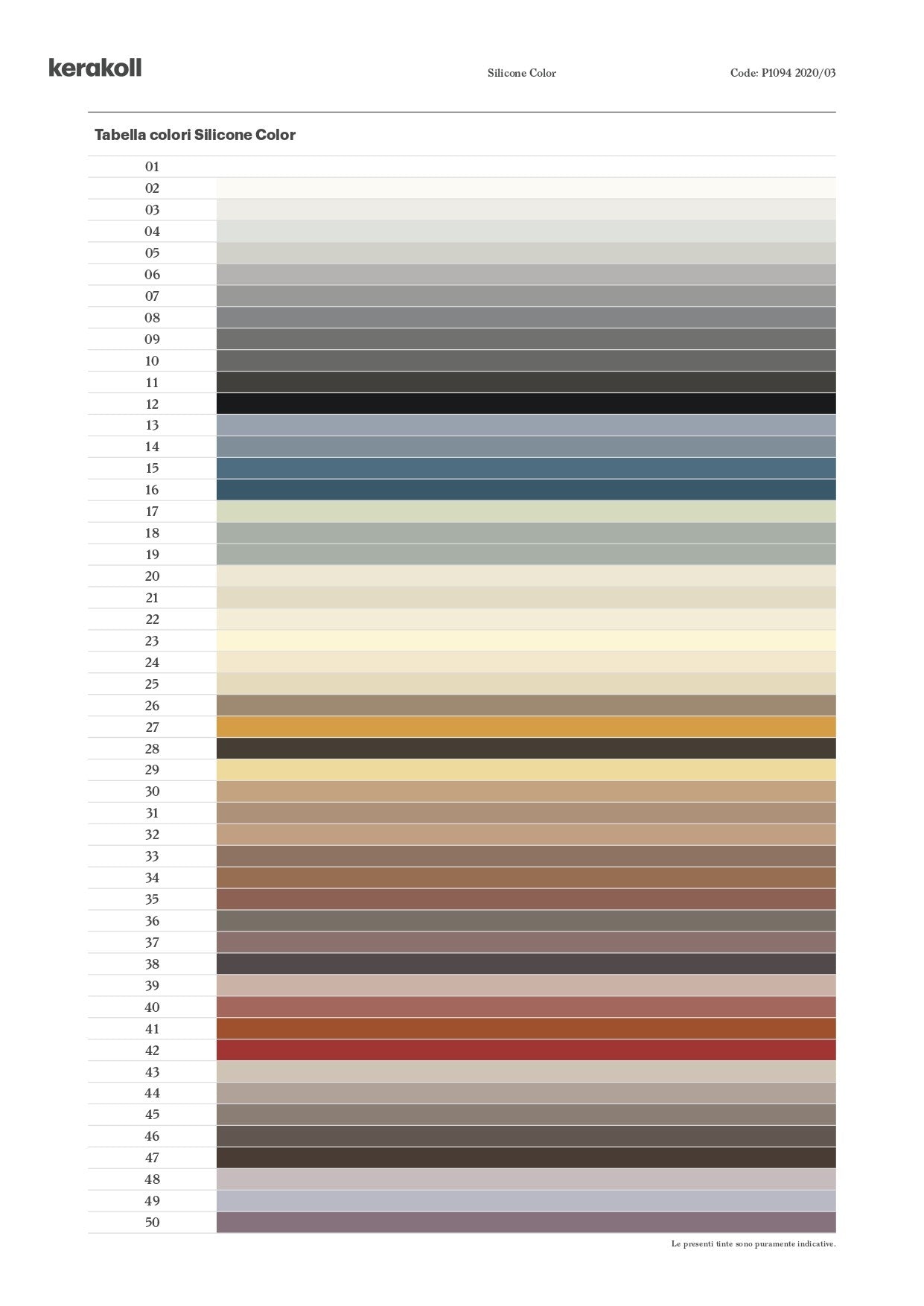 La pulizia dei residui di sigillante si esegue con comuni solventi come toluolo o benzina. Ad indurimento avvenuto Silicone Color può essere rimosso solo meccanicamente.